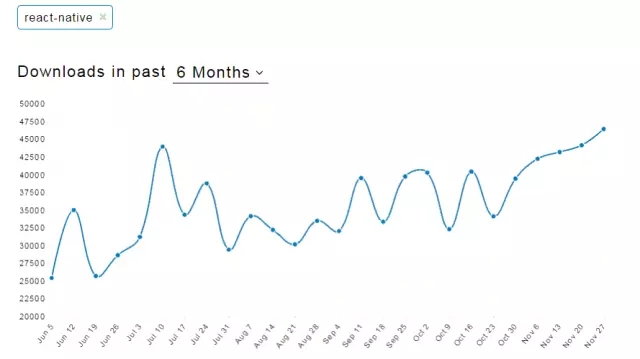 另一方面,React Native(來自Facebook)對(duì)本地 App 采用完全不用的開發(fā)路徑。它使用 JavaScript 代碼,類似 CSS 的樣式表和所有太熟悉的類似 HTML 的標(biāo)簽來布局。這里有一個(gè)圖表可以清楚地了解 React Native 的受歡迎程度: