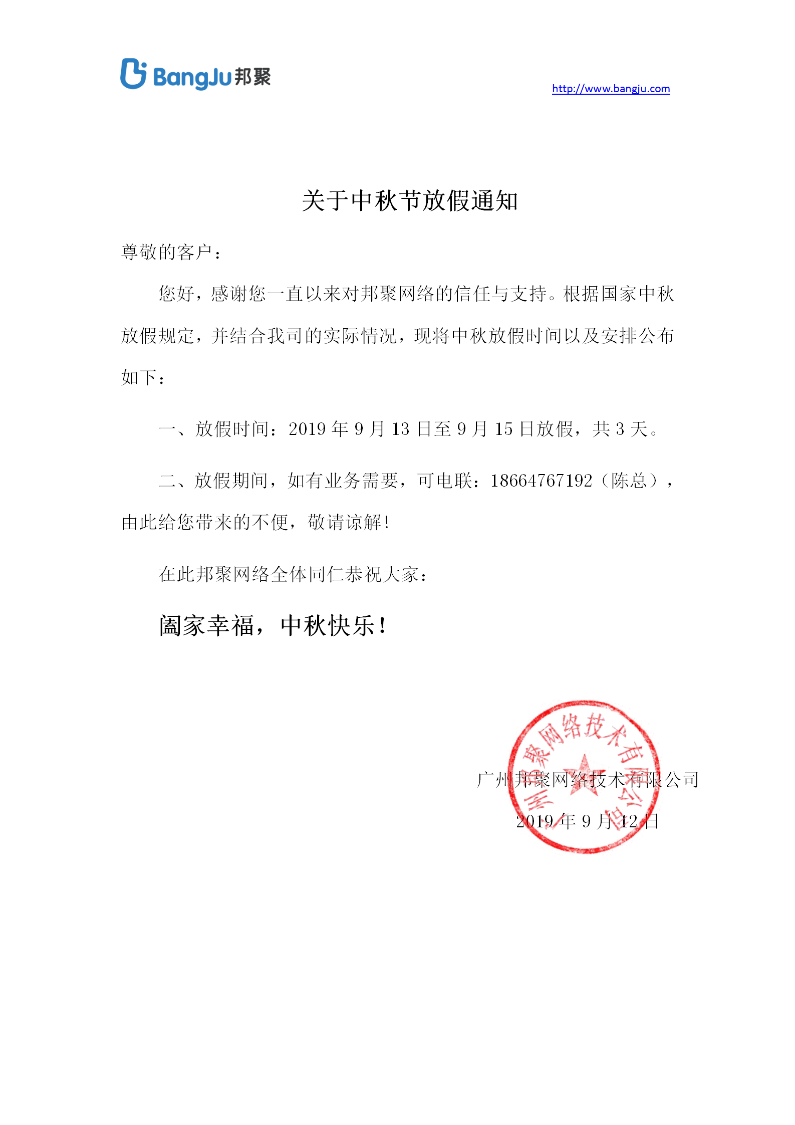 2019年邦聚網(wǎng)絡(luò)關(guān)于中秋放假通知