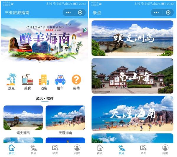 2. 現在小程序在微信上的入口越來越多,用戶通過搜索附近小程序即可輕松找到旅游小程序。在小程序上面,商家可以設置廣告輪播圖展示、自駕游路線設置、景區導覽、景區介紹、熱門景區推薦、路線規劃、導游介紹、購物等,有圖片與文字描述,讓用戶更加直觀的了解旅游勝地,相應的優惠活動也有詳細的說明,特別是節假日,還有各種套餐展示和不同的旅游風格展示,這些對于想旅游的人來說都是一個很好的旅游攻略。