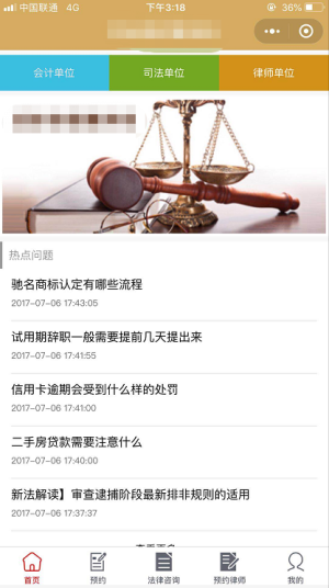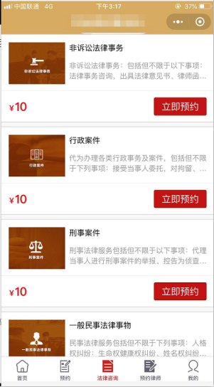 與過去的面對面咨詢、打電話咨詢不同,用戶只需要在法律咨詢預約小程序中輸入任何自己想要咨詢的問題,十分鐘內就會得到解答。除了在線咨詢之外,法律咨詢小程序還可以開設專業的法律知識介紹、熱點問題展示、律師簡介及律師風采展示、預約律師等。對于許多人來說,并不清楚每個律師具體受理哪些案件,只能盲目的去尋找、去一個個打電話咨詢。而通過法律咨詢小程序,可以將所能的提供的服務標記清楚,也可以對于一個案件的流程進行舉例說明,讓用戶更加了解案件流程。