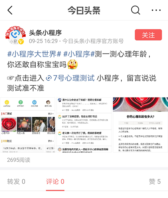 9月下旬,今日頭條更新了小程序三項(xiàng)新功能,許久沒(méi)有動(dòng)靜的頭條小程序,通過(guò)新發(fā)布的這三項(xiàng)功能,對(duì)自己在功能上進(jìn)行了更全面的武裝。這次更新,完全具備了頭條內(nèi)容社交的基因,可以將小程序直接分享到其他平臺(tái),還能通過(guò)小程序引導(dǎo)關(guān)注頭條號(hào),通過(guò)內(nèi)容和用戶(hù)產(chǎn)生互動(dòng),進(jìn)一步召回用戶(hù),同時(shí)也能提升對(duì)應(yīng)文章的推出率。