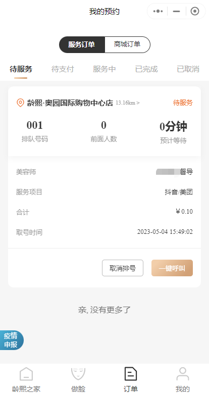 預約后,到店服務,服務完成,美容師端進行核驗,項目完成,等待用戶支付。
